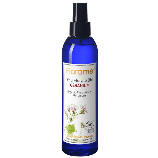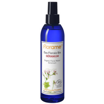 L'Eau florale Géranium bio 200 ml brumisateur - Florame est connue pour ses propriétés astringentes, antiseptiques et cicatrisantes et est plutot destinée aux peaux grasses et aux peaux mixtes.