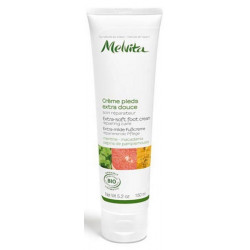 Soin apaisant et rafraîchissant, cette Crème extra-douce et bio 150ml Melvita soulage et adoucit les pieds fatigués et échauffés.