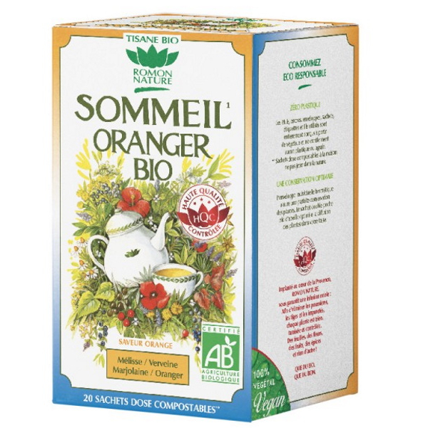 Cette Tisane sommeil Oranger Bio 20 sachets - Romon Nature apporte la synergie Mélisse - Verveine - Marjolaine - Oranger.